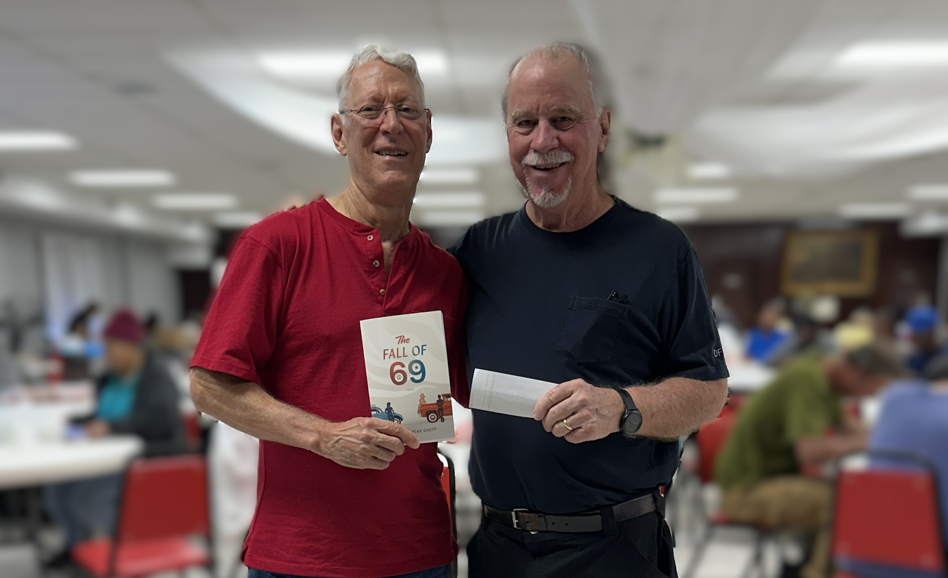 Bill provides Doug Fortner, Executive Director of Crossroads at Park Place in Houston, Texas with a book and a monitory contribution. Net royalties from the book are given to programs such as Crossroads that are dedicated to the eradication of homelessness and poverty.